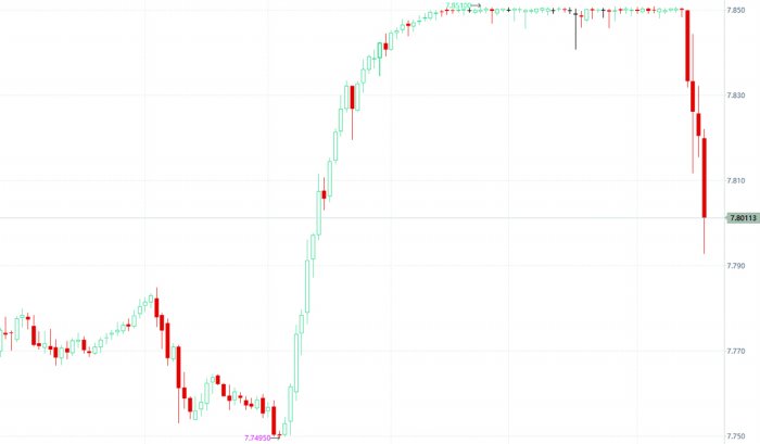 8月19日,港元对美元汇率急速拉升,截至18时上海证券报记者发稿时,港元对美元最高升至7.7926,日内涨幅达0.35%。
